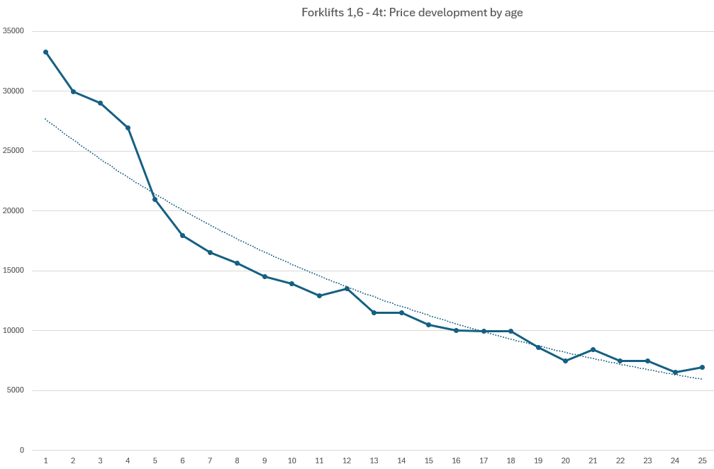 Unsere Analyse zur Preisentwicklung ab Jahr eins nach Alter, ebenfalls für Stapler zwischen 1,6 und 4 Tonnen Tragkraft, zeigt ein klares Bild: