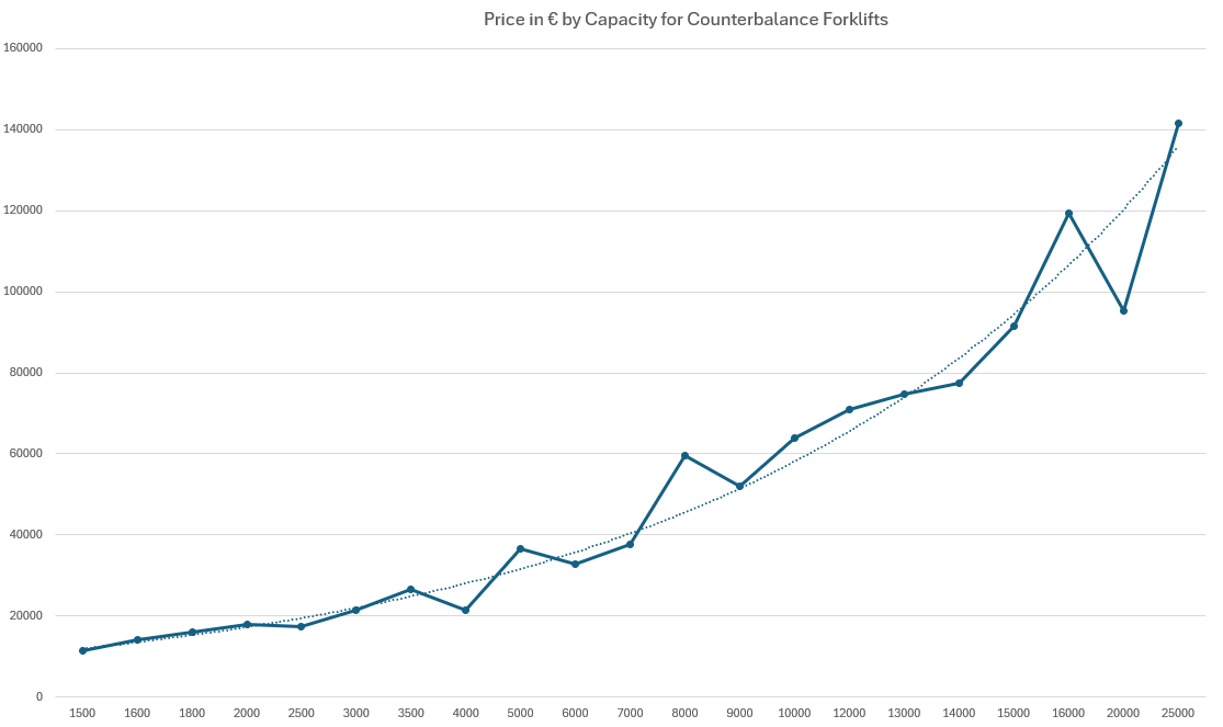 Direkt nach der Bauart ist die maximale Tragkraft einer der wichtigsten Preistreiber. Die einfache Formel lautet: Je mehr Gewicht ein Stapler heben kann, desto teurer ist er. Das liegt nicht nur an der stärkeren Hydraulik, sondern auch an einem massiveren Rahmen, einem stärkeren Motor und einem höheren Eigengewicht als Gegengewicht. Für unsere Analyse haben wir uns auf den gängigsten Staplertyp, den Frontstapler, konzentriert.