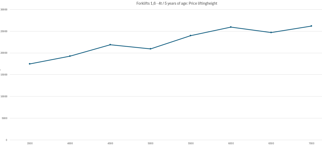 Unsere Analyse für fünf Jahre alte Stapler mit einer Tragkraft von 1,6 bis 4 Tonnen zeigt einen klaren Trend: