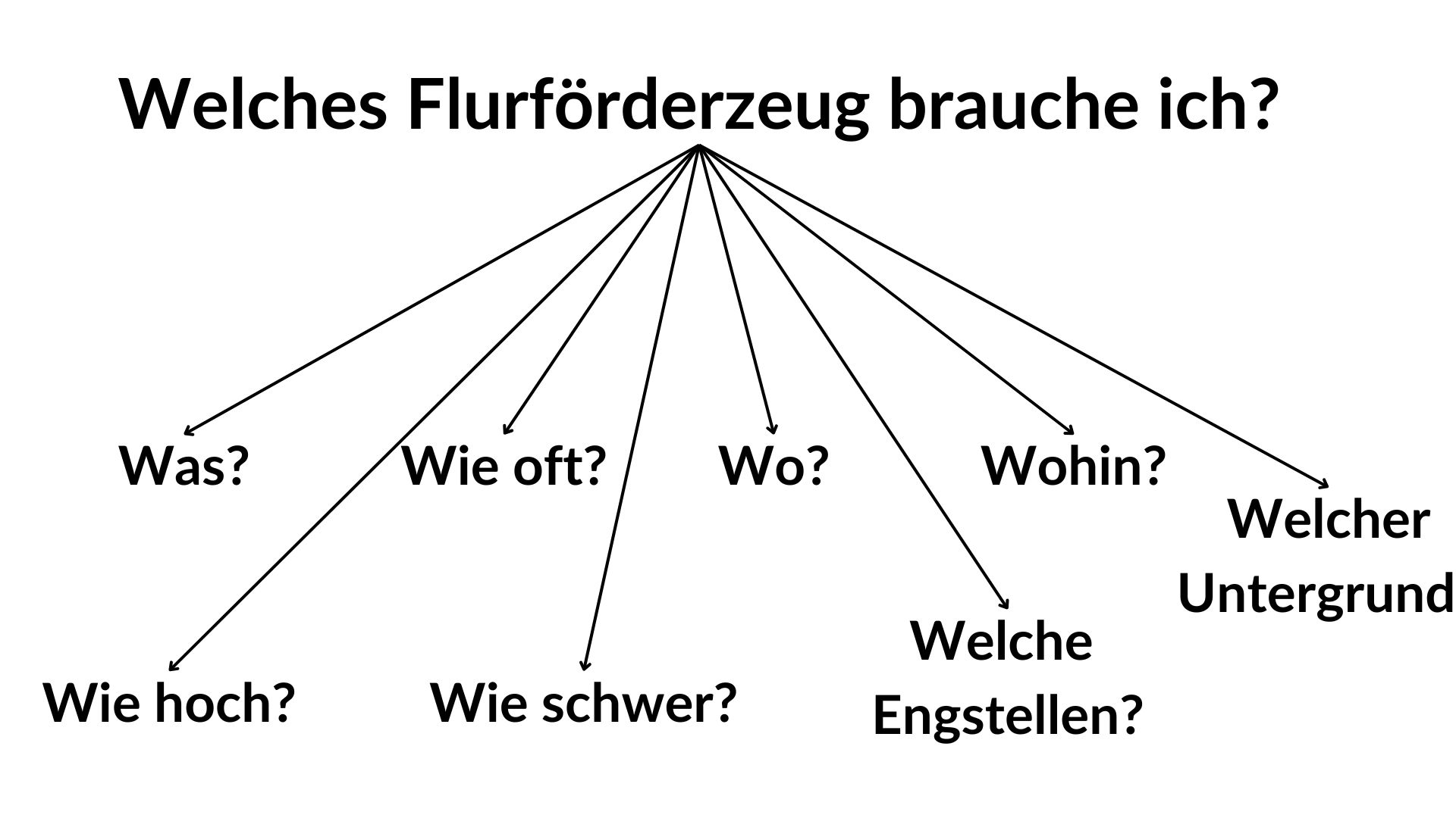 Um das richtige Flurförderzeug für Ihren Bedarf zu ermitteln, sollten Sie sich im klaren sein, welchen Einsatzzweck sie haben. Wie auch in vielen anderen Bereichen des täglichen Lebens, helfen Ihnen die sogenannten „W-Fragen“ weiter, ein klares Bild Ihres Bedarfs zu erlangen: