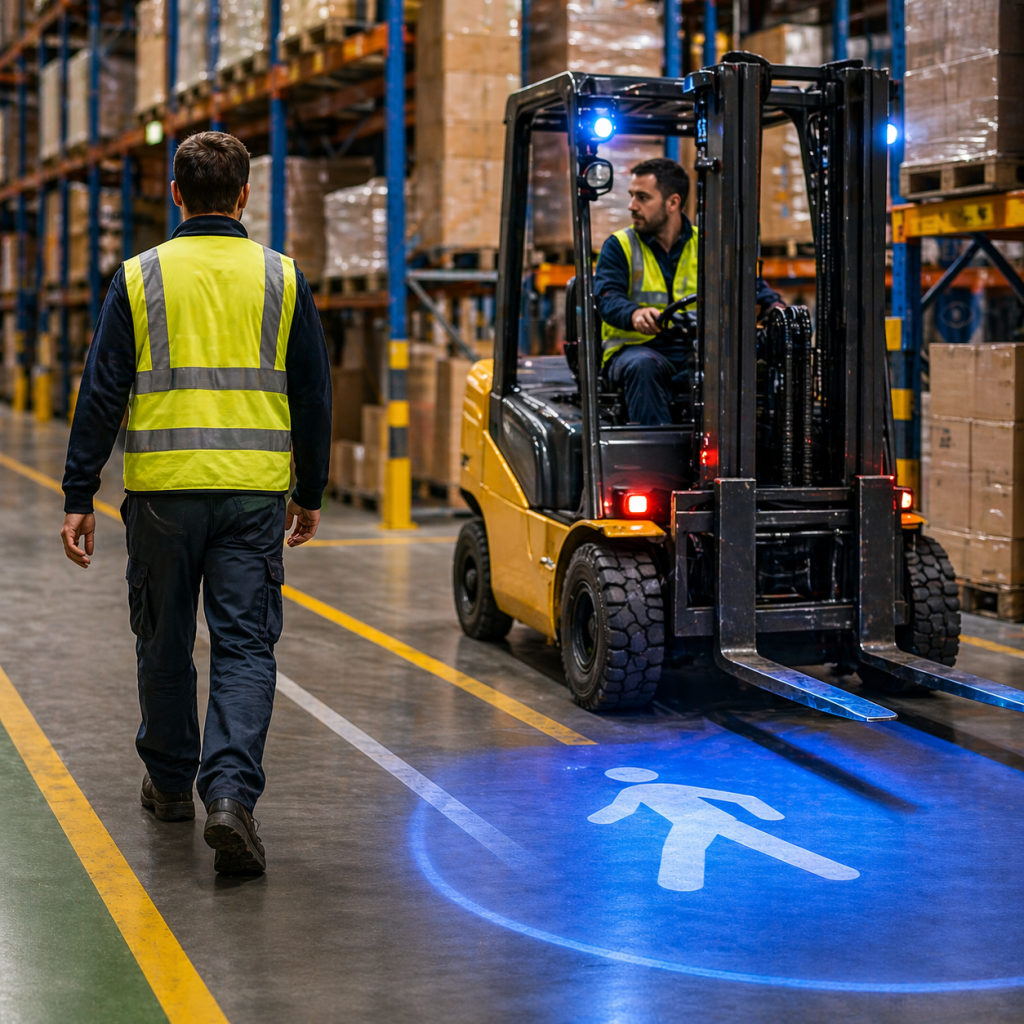 If a forklift truck is equipped with zone warning lights, you should not enter this area under any circumstances. The blue warning lights on the forklift truck mark the danger zone in front of the vehicle. Red marks the danger zones around the forklift truck.